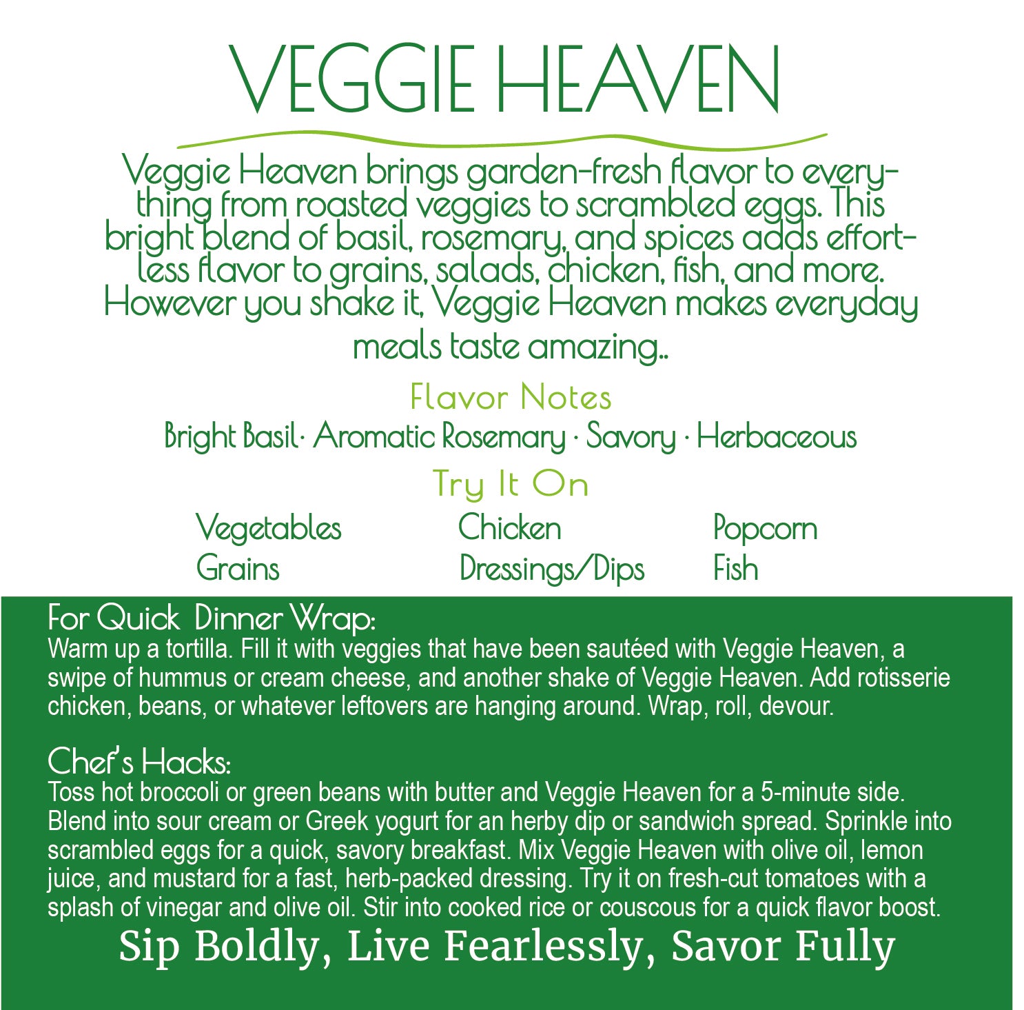 Veggie Heaven isn’t just for veggies anymore—this basil and rosemary-forward blend is your go-to seasoning for everything from fresh garden tomatoes to perfectly seasoned chicken, fish, rice, and even popcorn. Crafted with organic ingredients and packed with bold, aromatic flavor, it’s the effortless way to bring out the best in your favorite meals. Whether you're roasting, grilling, or just sprinkling on a quick snack, Veggie Heaven makes every bite simply irresistible.